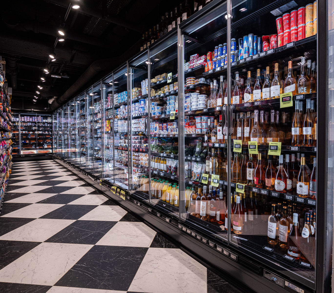 Ein Paradebeispiel hierfür ist der Bereich für hochwertige, frische Lebensmittel, die in den hohen Kühlregalen SkyView aus der Reihe SkyEffect von Bonnet Névé präsentiert werden. Die Modelle wurden entlang der Wand montiert und verfügen über vollverglaste Türfronten mit transparenten Griffen, sodass die exzellente Sichtbarkeit und Konservierung des Warensortiments gewährleistet ist. Hinzu kommen mehrere Exemplare des Modells SkyLook aus der gleichen Reihe, sie zählen zur Effizienzklasse B und verbinden, genau wie die übrigen Modelle der Reihe SkyEffect, maximale Effizienz mit einem eleganten Design und optimiertem Merchandising.