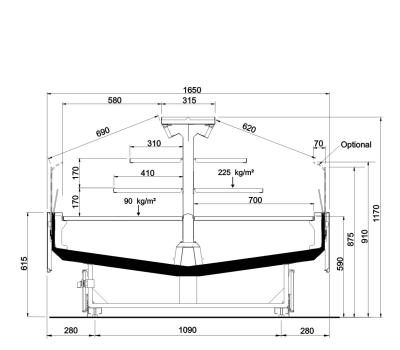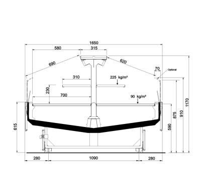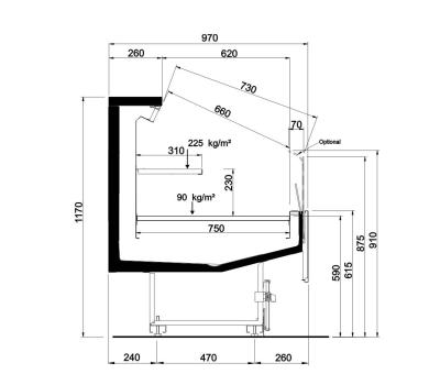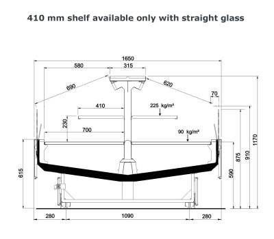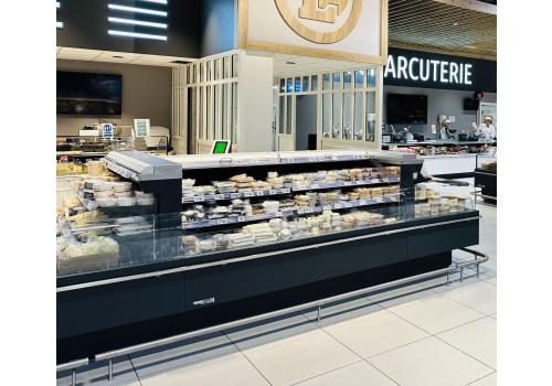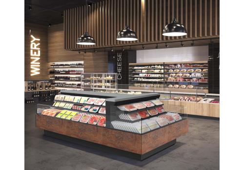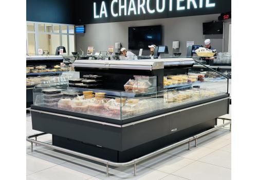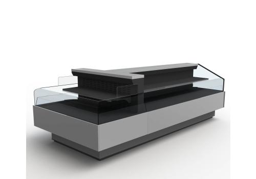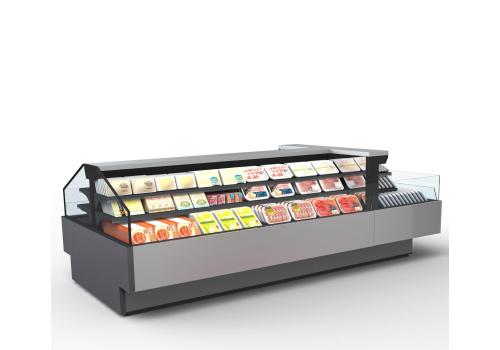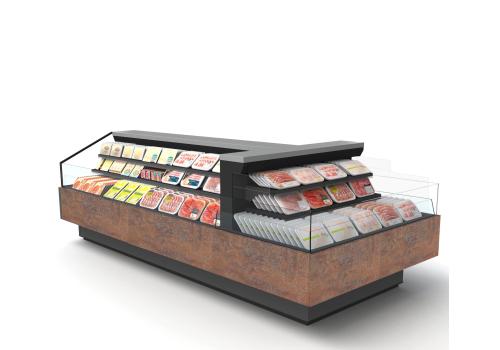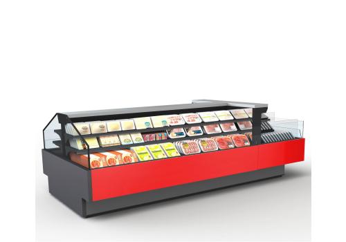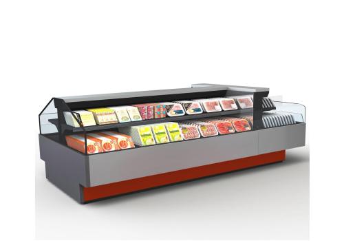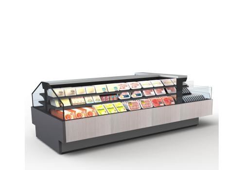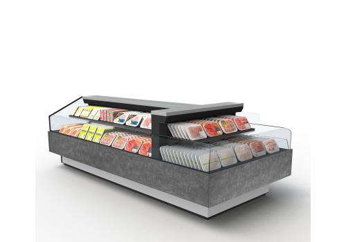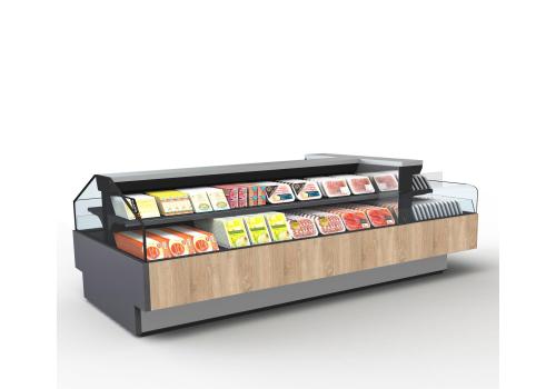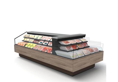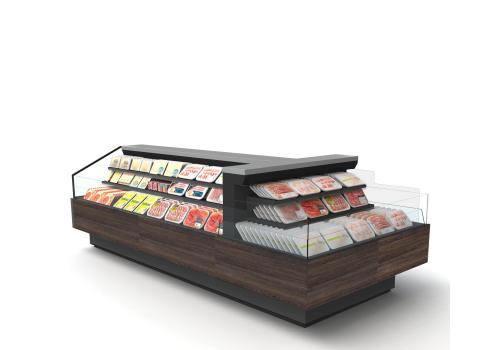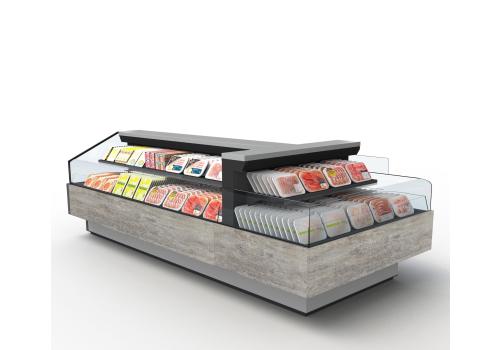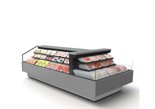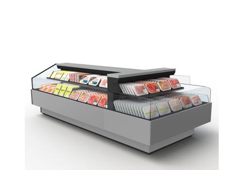 Offenes, halbhohes Kühlmöbel zur Selbstbedienung mit doppelter Wanne und einem hervorragenden Verhältnis von Warenpräsentationsfläche und beanspruchter Bodenfläche, speziell geeignet für frische, abgepackte Produkte