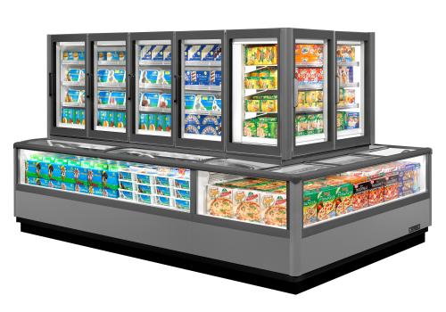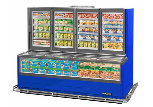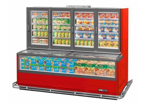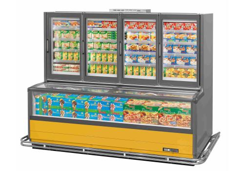 Vertical display cabinet with remote unit for frozen products. It is characterised by the combined solution, which comprises of a tub protected by sliding glass lids and a superstructure with full height doors negating a canopy.