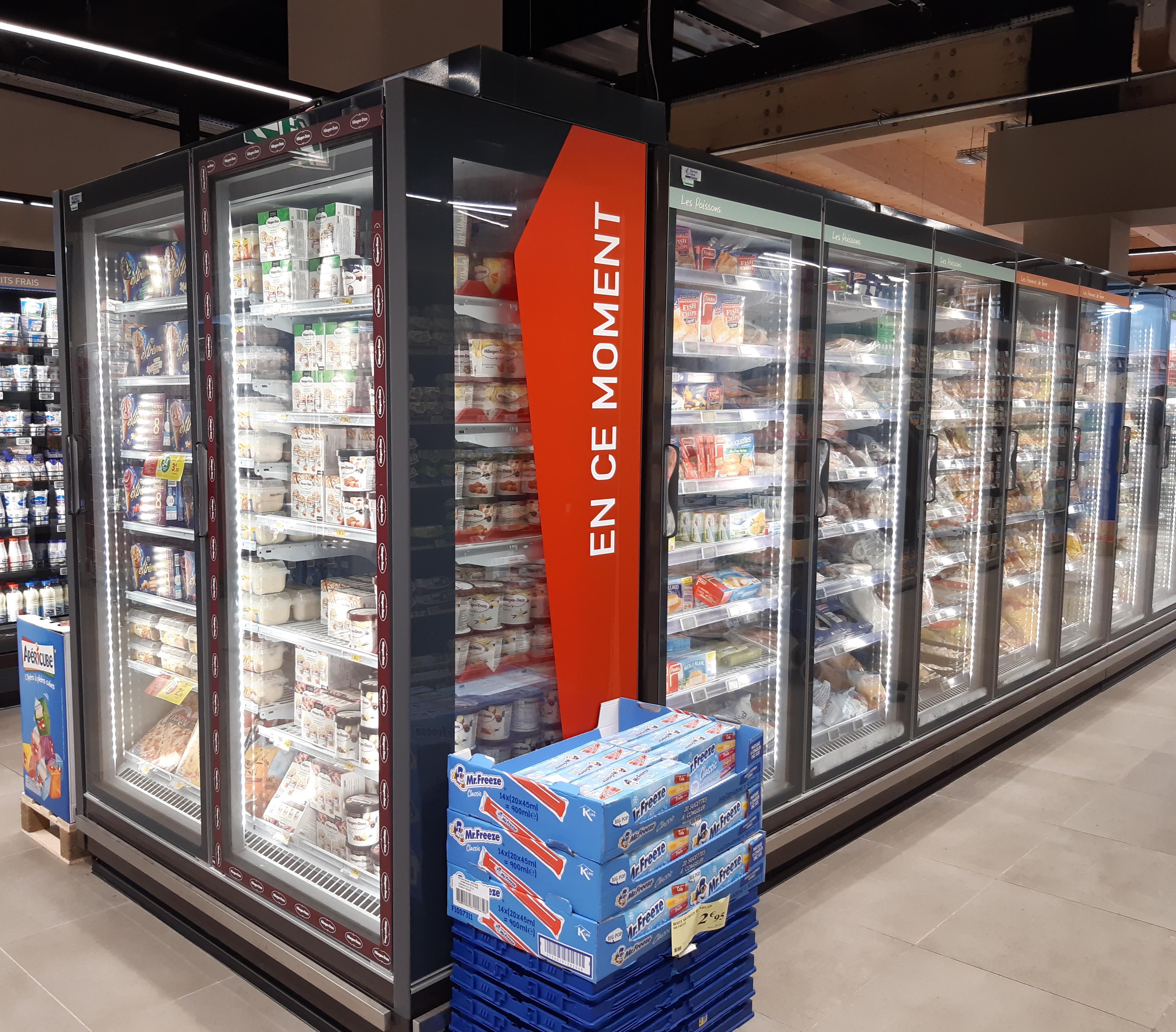 Armario de grupo remoto para productos congelados. El diseño exclusivo, las puertas a toda altura y las soluciones tecnológicas adoptadas ofrecen un merchandising y una visibilidad de los productos sin precedentes.