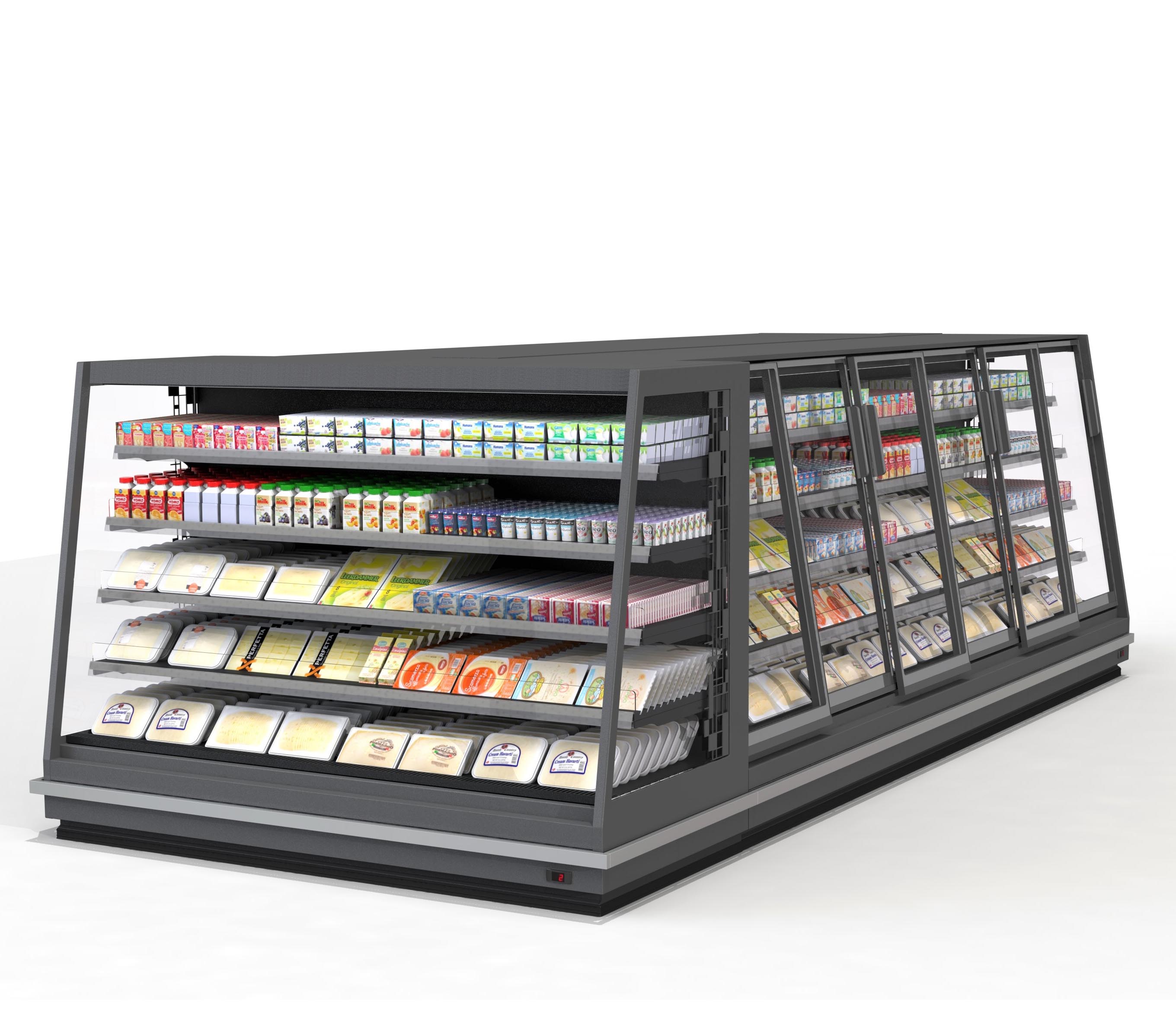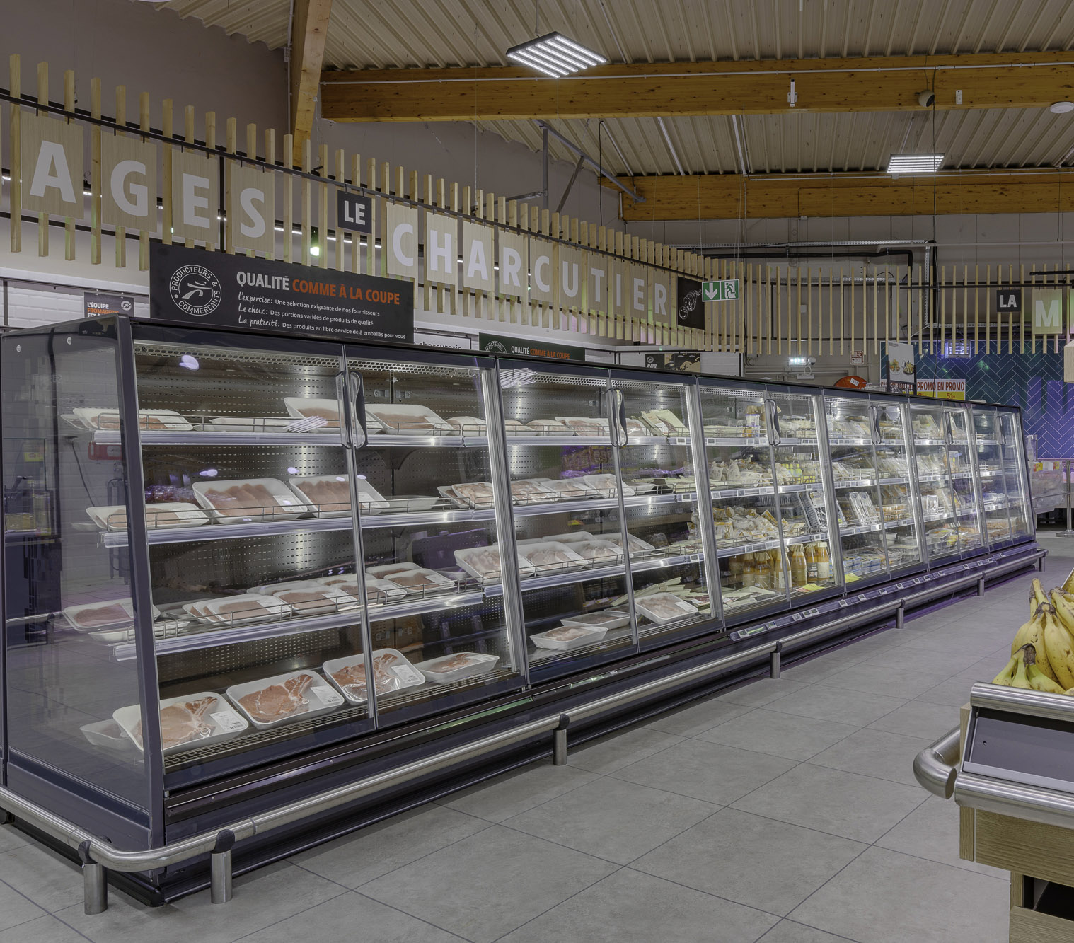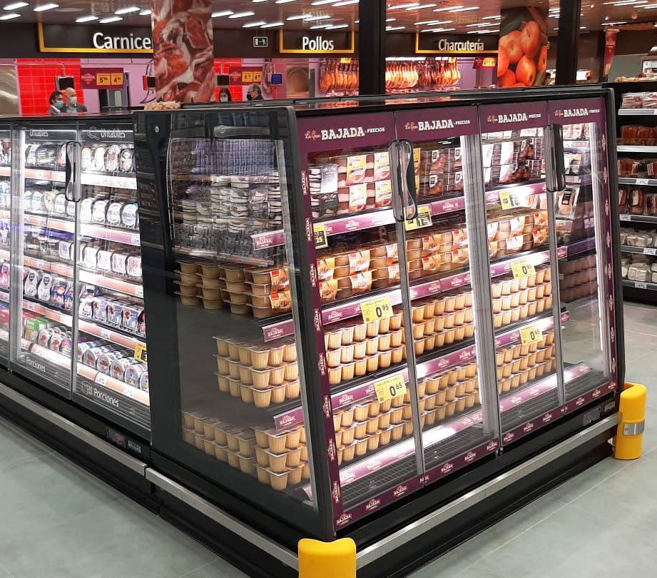 Semimural refrigerada con puertas batientes o correderas de grupo remoto para productos frescos preenvasados. Se caracteriza por un excelente merchandising, consumos reducidos y una perfecta conservación del producto expuesto.