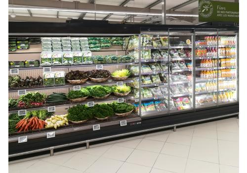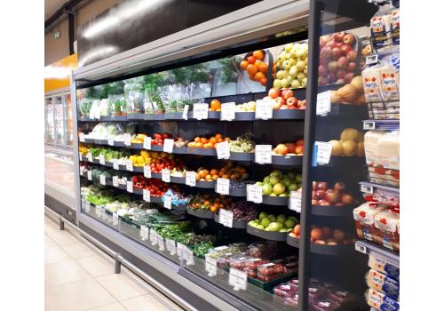 Mural refrigerada abierta de grupo remoto para la presentación y el almacenamiento de frutas, verduras, plantas y flores.