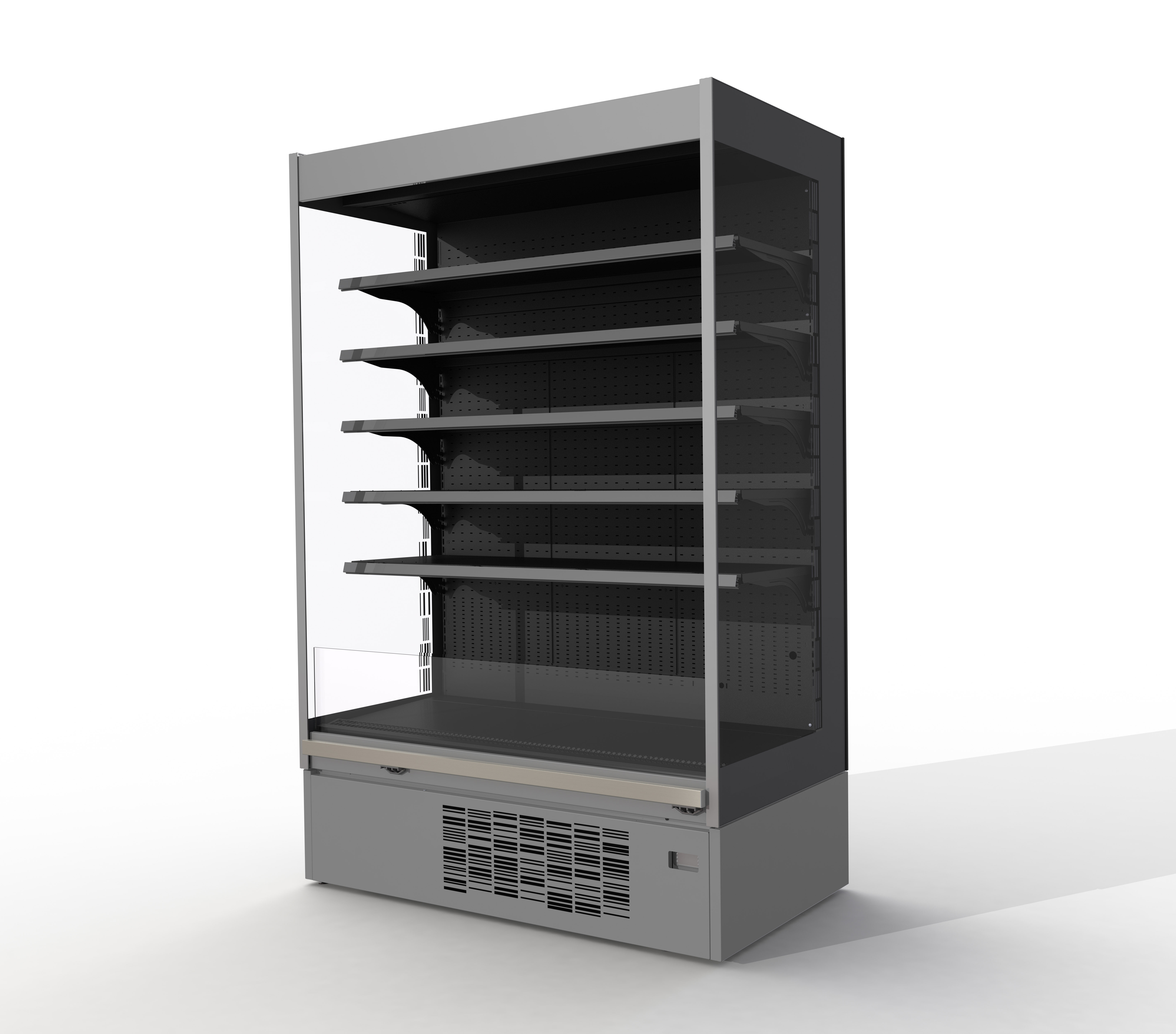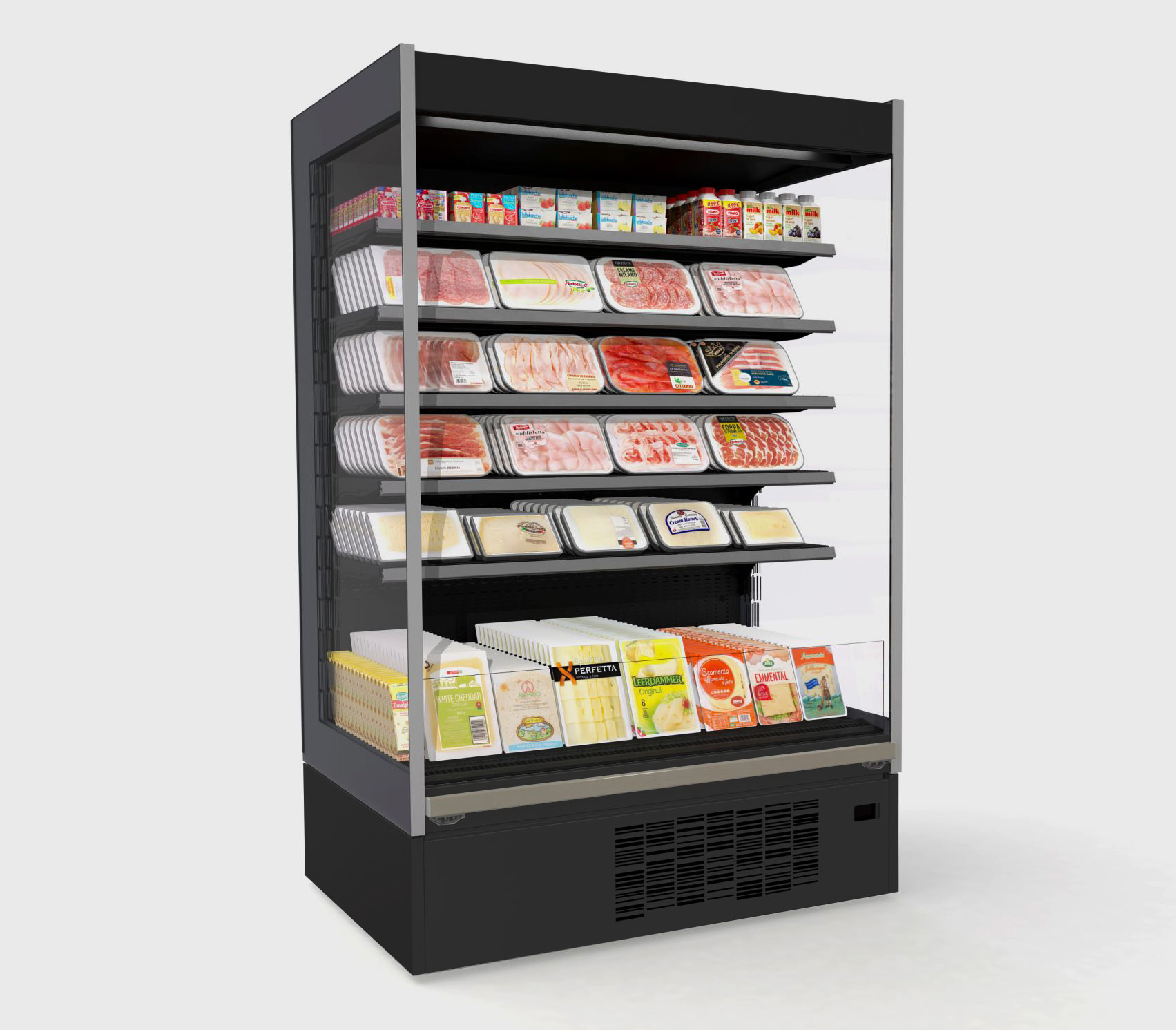 Mural refrigerado abierto con grupo incorporado que funciona con gas propano R290 y que presta especial atención a la ecosostenibilidad y al ahorro de energía.