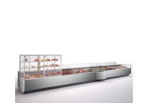 Possibilité d'innombrables solutions grâce aux différentes longueurs, aux angles ouverts et fermés et aux multiples superstructures et vitrages. Son design linéaire et moderne, personnalisable avec différents matériaux, permet d'aménager de la meilleure manière tous les magasins.