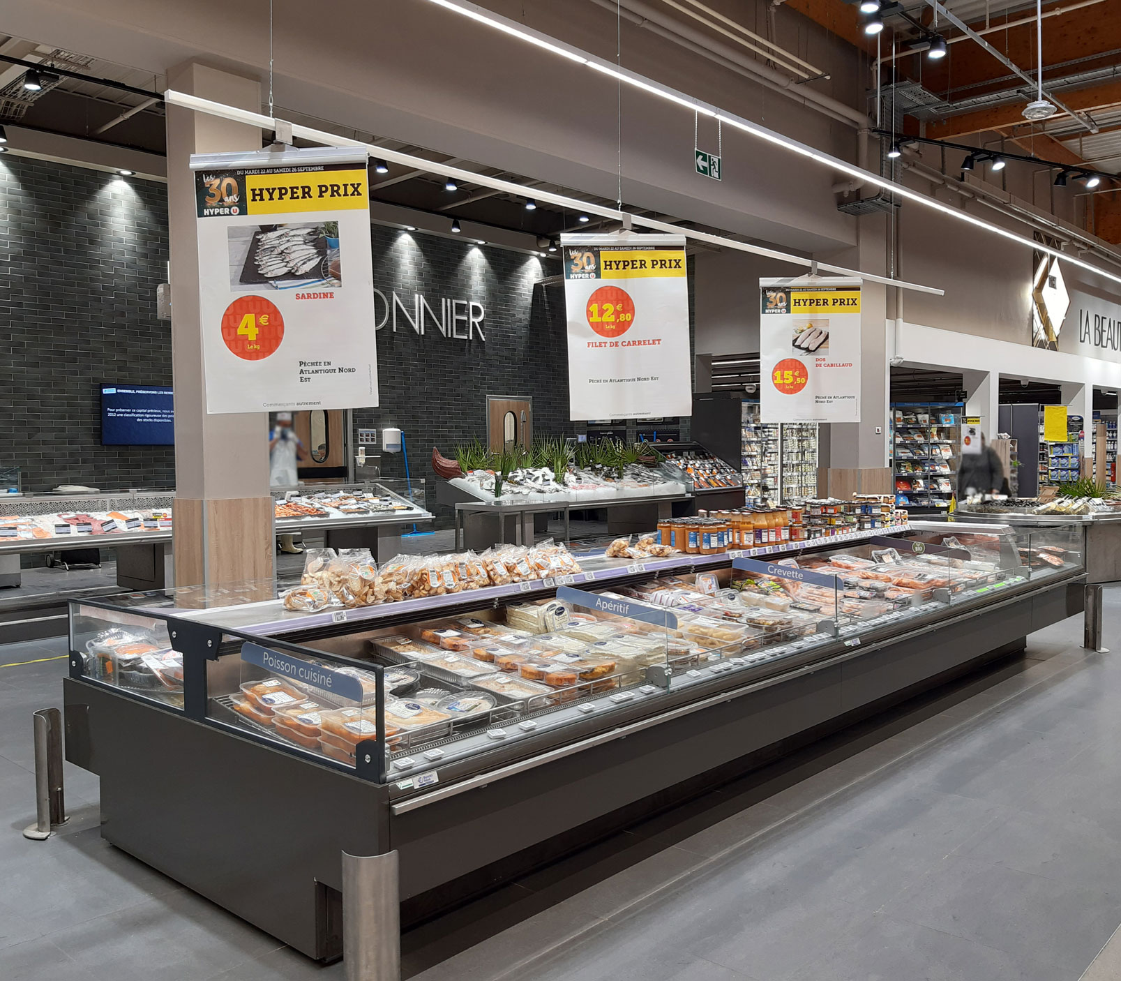 Grâce à la vaste gamme de vitrines réfrigérées des marques Bonnet Névé et Eurocryor, Epta France a été en mesure de sélectionner les meilleures solutions pour garantir une présentation dans les règles de l'art de chaque catégorie de produits, chacune exposée dans le meuble réfrigéré le plus approprié. Distinguons notamment la Poissonnerie LS, où les meubles réfrigérés Dualio de Bonnet Névé permettent de segmenter l'offre avec une exposition étudiée pour orienter le regard du consommateur. Le meuble réfrigéré Kaleïdo de Bonnet Névé a été proposé avec des étagères en cascade pour la meilleure présentation des poissons fumés, élaborés et conditionnés dans le point de vente. À côté, avec un jeu de hauteurs qui rythme l'espace, les meubles réfrigérés verticaux SkyView Plus de Bonnet Névé présentent l'offre complémentaire en Saurisserie LS. Les zones dédiées aux espaces Le Boucher, Le Charcutier et Le Fromager sont un autre exemple de la capacité de Bonnet Névé à réaliser des solutions ad hoc pour répondre aux besoins spécifiques de cet hypermarché. Pour rapprocher les produits du regard des consommateurs, Bonnet Névé a offert un modèle personnalisé de la vitrine réfrigérée Shape Design. Le meuble est disposé sur un palier, caché par la façade en bois clair et, pour faciliter encore plus l'interaction entre le consommateur et l'opérateur, il a été conçu avec un vitrage surbaissé. Signalons aussi, dans l'espace dédié à la Crémerie LS, l'intégration avec les meubles réfrigérés semi-verticaux Twin Midi d'Eurocryor. Grâce aux étagères en cascade, et à la possibilité de présenter sur le toit des articles complémentaires, Twin Midi est le choix idéal pour améliorer la visibilité des spécialités des producteurs locaux, tout en favorisant le cross-merchandising.
