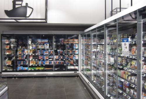 L'aménagement est complété par les meubles réfrigérés verticaux SkyView Plus Closed aux portes totalement transparentes, pour les rayons FLS (Frais Libre-Service) et par le meuble réfrigéré pour surgelés Cosmos Eco4, réalisés en blanc structuré avec des éléments d'esthétique gris anthracite, tous deux signés Bonnet Névé. Enfin, les meubles réfrigérés à plat Duo Max de Bonnet Névé pour le poisson libre-service et le meuble réfrigéré hybride très innovant Impact d'Eurocryor, dédié à la proposition complémentaire de sushis et aux préparations asiatiques, modèlent tous deux le rayon marée.