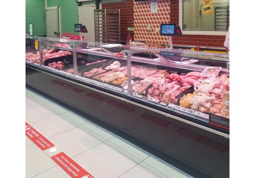 Traditional refrigerated display case designed to exhibit and preserve fresh non-packed foods, particularly meat cuts.